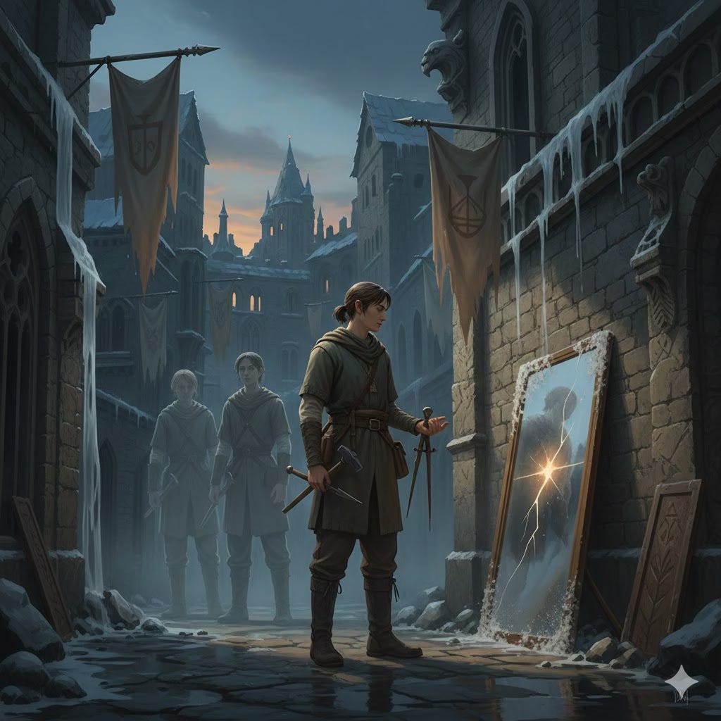 The city called this season the Long Thaw. Stone walls wept quietly. Old banners sagged, their symbols faded into something unreadable. Everything looked intact, yet subtly misaligned, like a song played in the wrong key.
